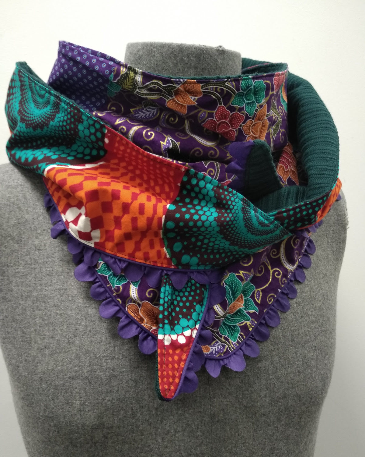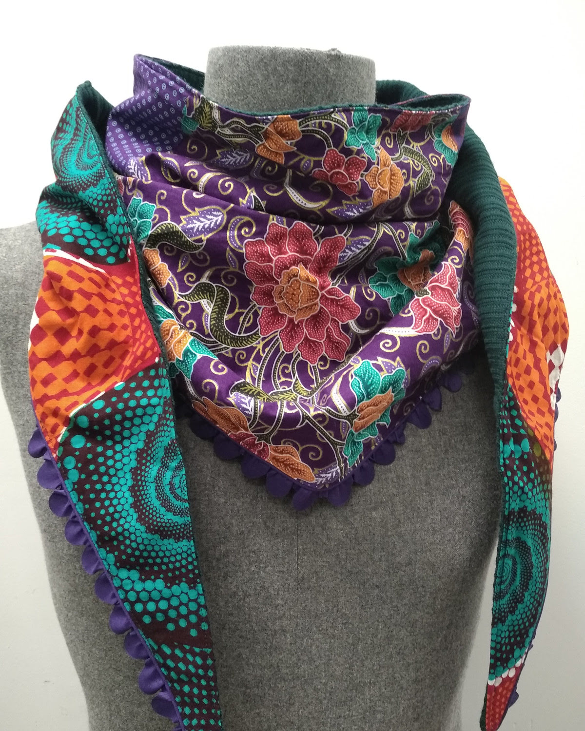 Tissus extérieur : patchwork de cotons ethniques (wax africain, batik indonésien) 100% coton et de viscose imprimée en France