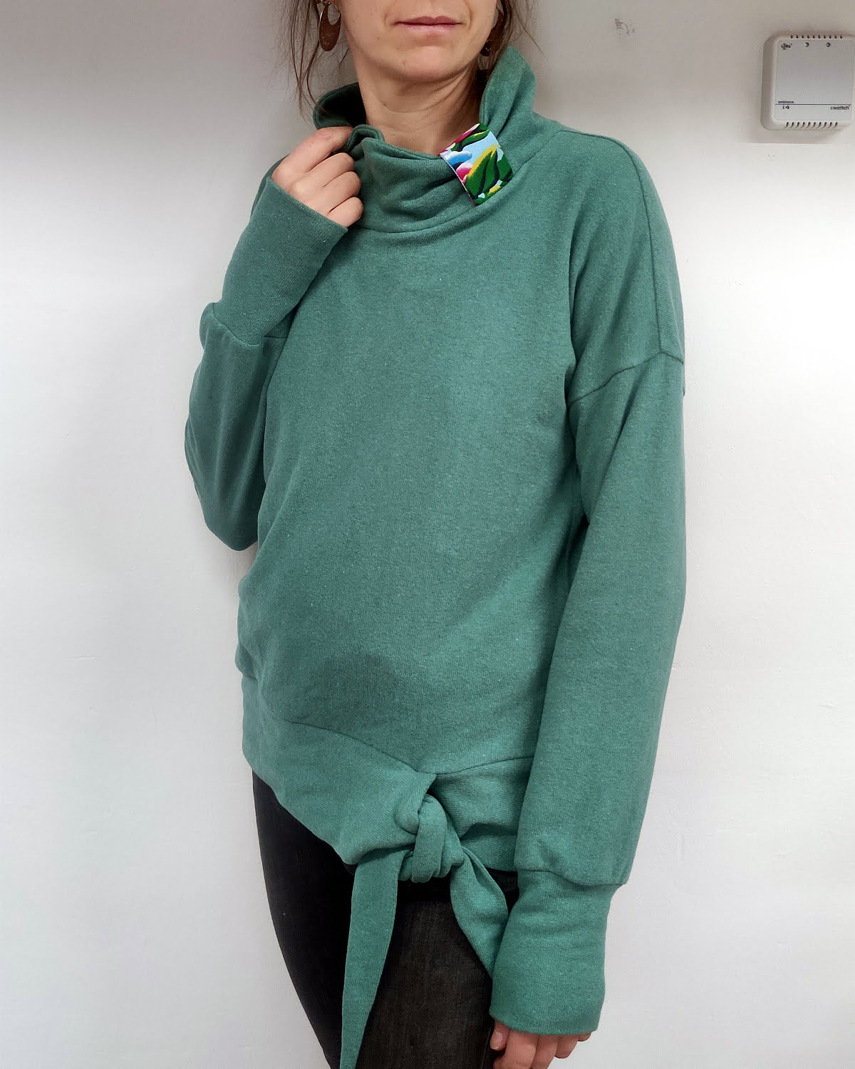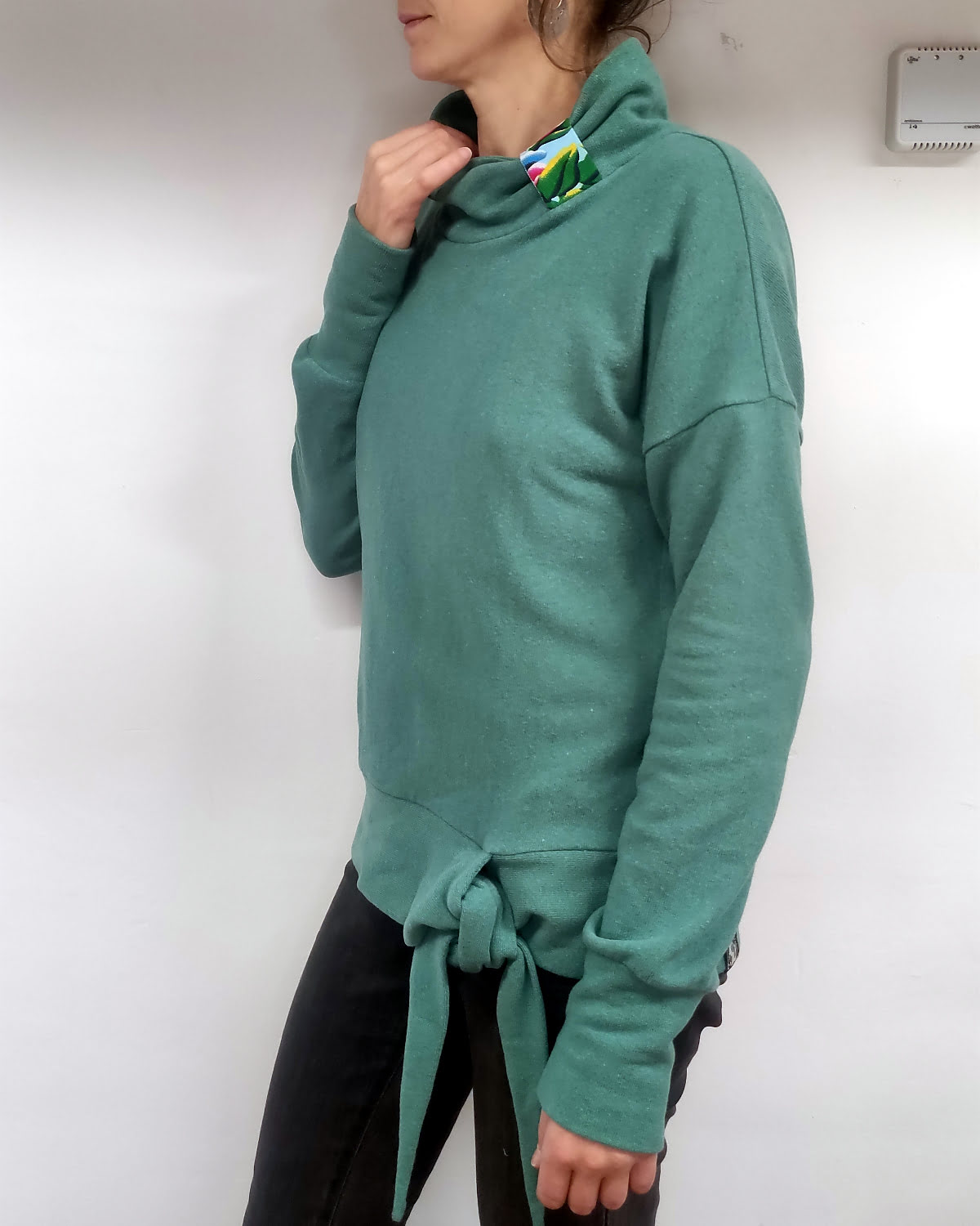 Col tombant et bas du pull qui se noue dans un joli nœud